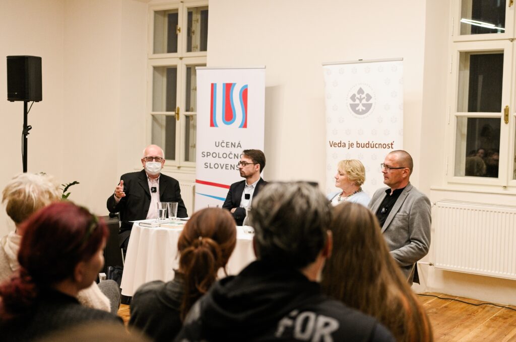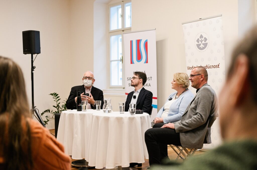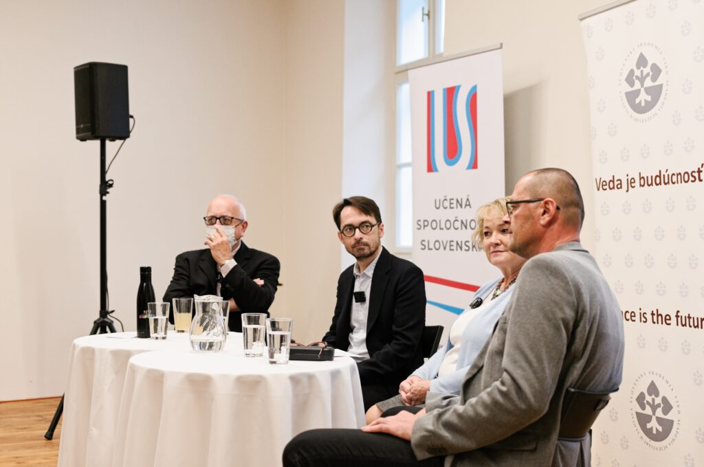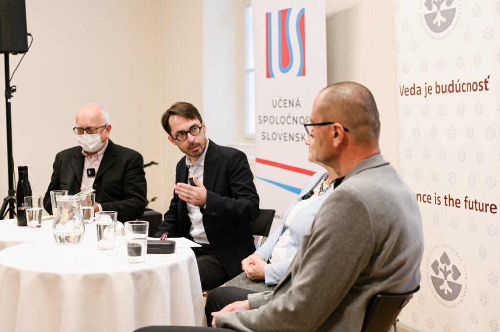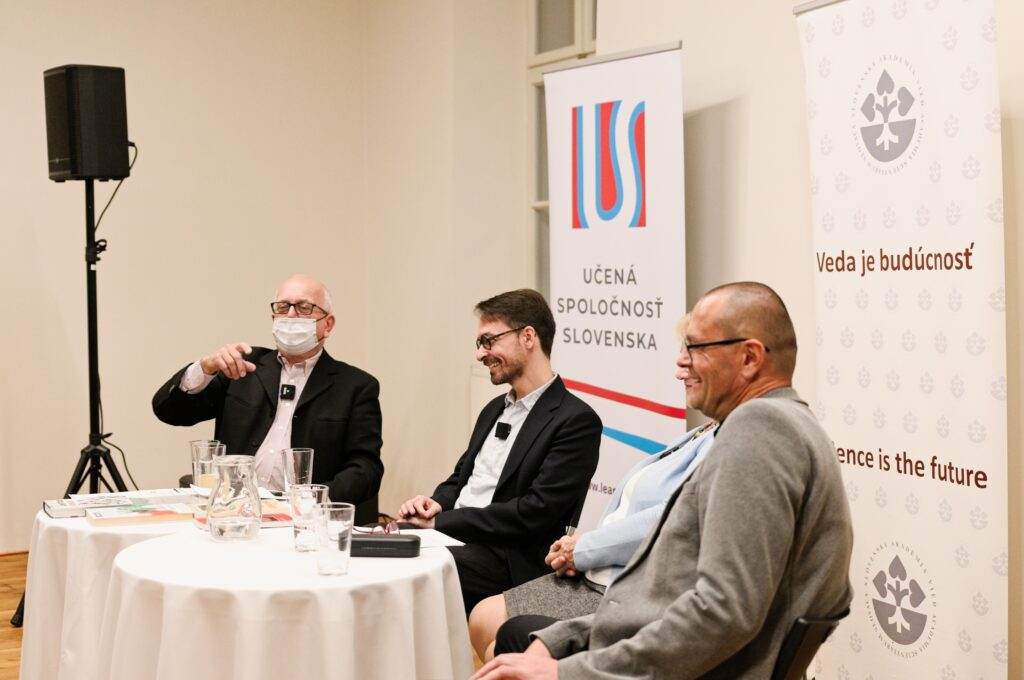 Diskutujúci: historička Tünde Lengyel z Historického ústavu SAV, v. v. i., psychológ Gabriel Bianchi z Ústavu pre výskum sociálnej komunikácie SAV, v. v. i. a zoológ Pavol Prokop z Ústavu zoológie SAV, v. v. i. a Prírodovedeckej fakulty UK.