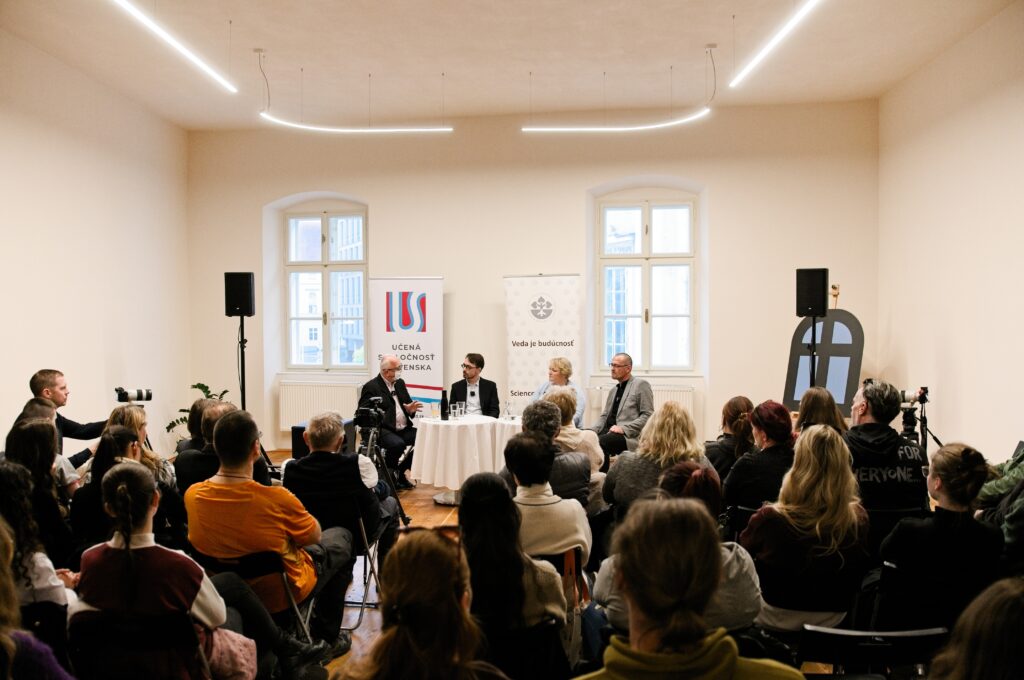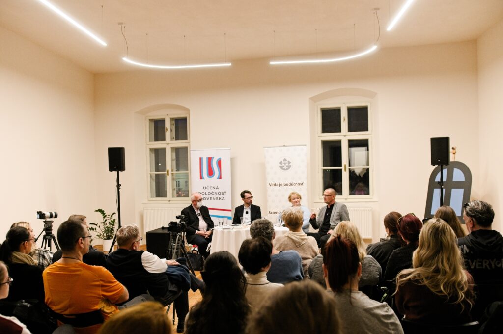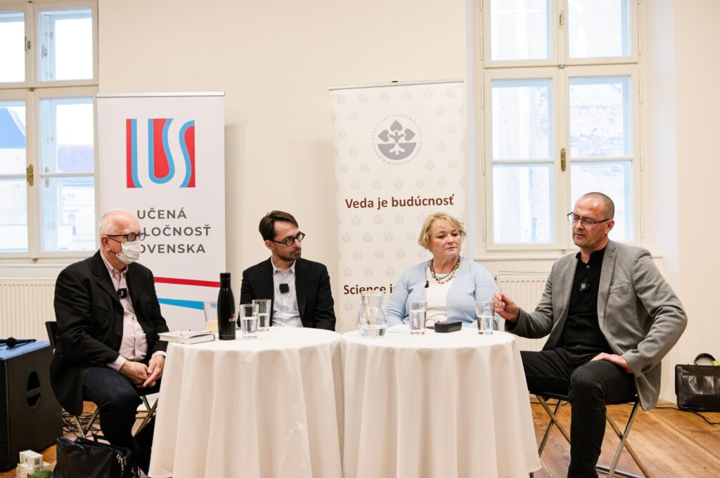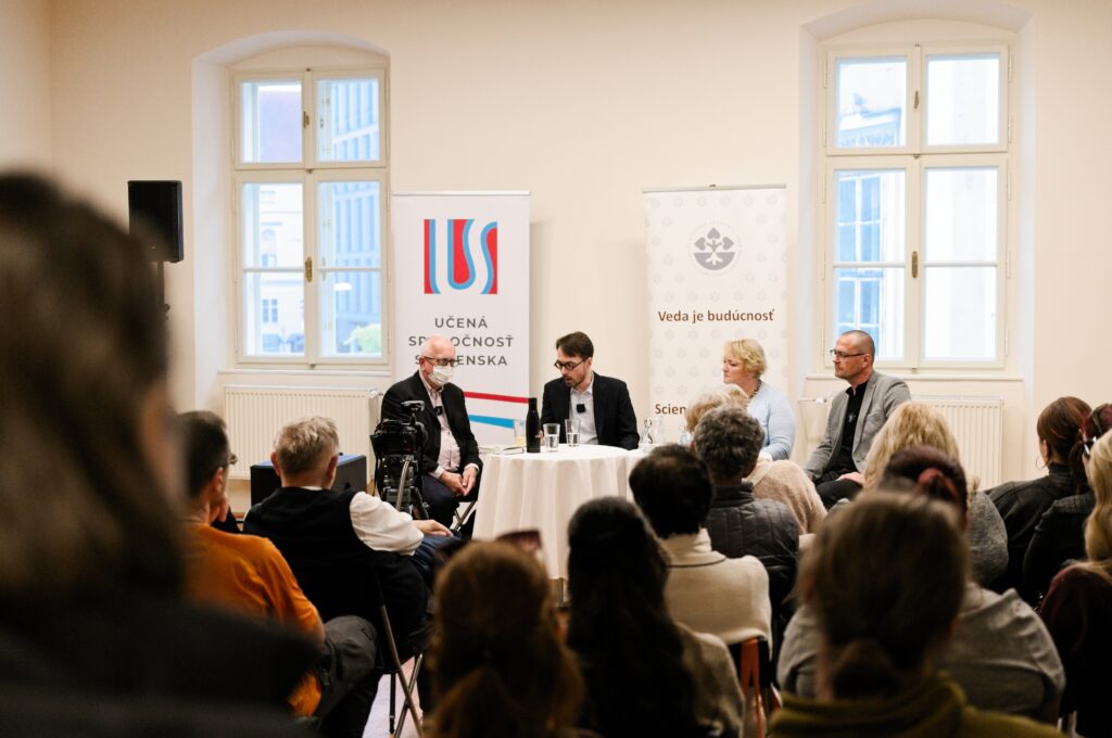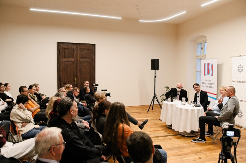 Diskutujúci: historička Tünde Lengyel z Historického ústavu SAV, v. v. i., psychológ Gabriel Bianchi z Ústavu pre výskum sociálnej komunikácie SAV, v. v. i. a zoológ Pavol Prokop z Ústavu zoológie SAV, v. v. i. a Prírodovedeckej fakulty UK.